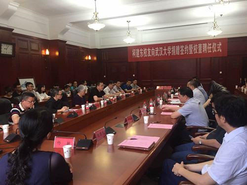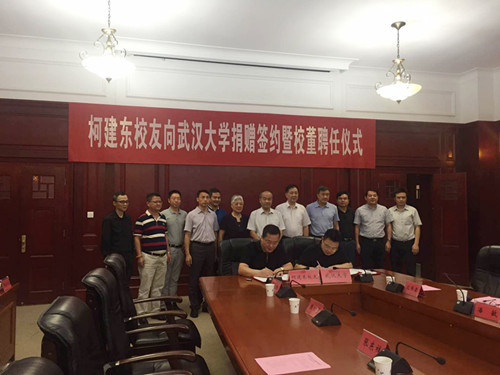 捐贈及聘任儀式上,武漢大學(xué)副校長周葉中對柯總重回母校表示歡迎,副校長李建成代表武漢大學(xué)與柯總簽署捐贈協(xié)議并頒發(fā)捐贈證書,武漢大學(xué)校長竇賢康教授發(fā)表講話,并向柯總頒發(fā)了武漢大學(xué)校董聘書;經(jīng)濟與管理學(xué)院院長潘敏教授代表學(xué)院向柯總的捐贈表示感謝,并表示將專款專用使捐款發(fā)揮最大的價值。最后柯總發(fā)表講話表達了重回母校的感慨,感謝母校老師們當年的栽培,并向母校匯報了多年事業(yè)沉淀取得的成績,同時也表示愿為母校人才培養(yǎng)盡一己之力。