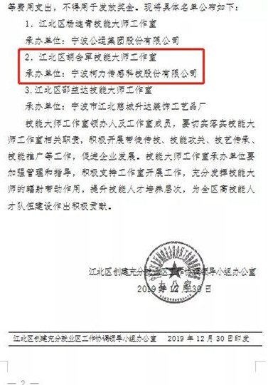 “胡會(huì)軍技能大師工作室”由公司承辦,以柯力技術(shù)能手、柯力之星、2018年度江北工匠“胡會(huì)軍”命名。
