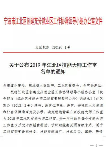 近期“2019江北區(qū)技能大師工作室名單” 公布,公司“胡會(huì)軍技能大師工作室”入選名單中的三家單位之一。每家工作室將獲得3萬(wàn)元經(jīng)費(fèi)補(bǔ)助,用于工作室購(gòu)置設(shè)備、技術(shù)交流推廣、技術(shù)攻關(guān)、革新、研修。