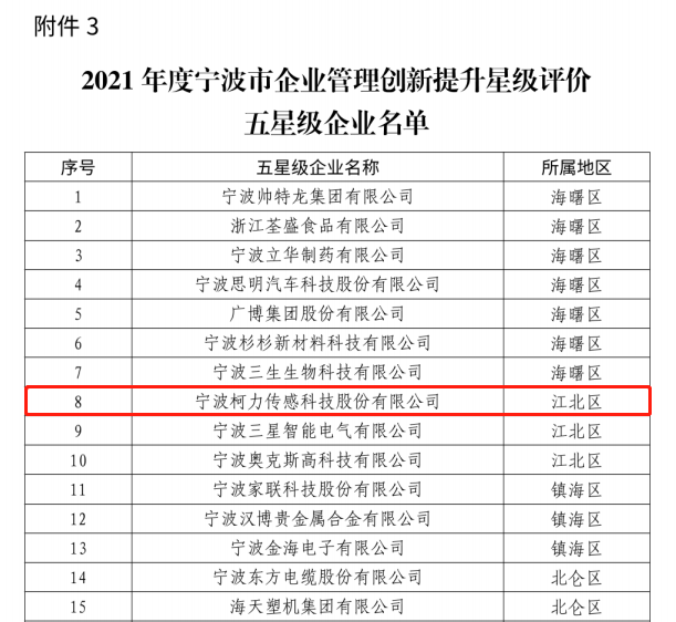 寧波市經(jīng)濟(jì)和信息化局下發(fā)關(guān)于公布2021年度寧波市企業(yè)管理創(chuàng)新提升星級(jí)評(píng)價(jià)四星級(jí)、五星級(jí)企業(yè)的通知。根據(jù)前期各地星級(jí)評(píng)價(jià)情況,市經(jīng)信局通過專家復(fù)審、集中評(píng)審,認(rèn)定四星級(jí)企業(yè)391家,五星級(jí)企業(yè)110家,其中寧波柯力傳感科技股份有限公司獲批五星級(jí)企業(yè)。